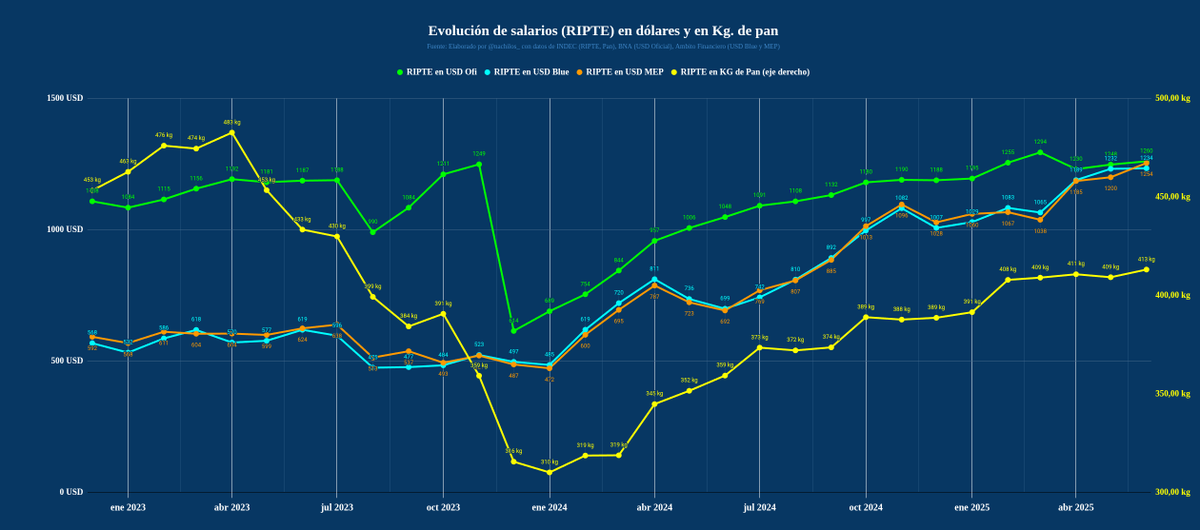 Resumiendo lo que tengo hasta ahora. Entre Enero 2024 y Enero 2025... - El salario (RIPTE) aumentó un 112,15% en dólares blue. - El salario (RIPTE) aumentó un 26,23% en kg de pan. - INSISTO: Ojo, no vale comparar esos dos números como uno haría por ej. al comparar aumento de