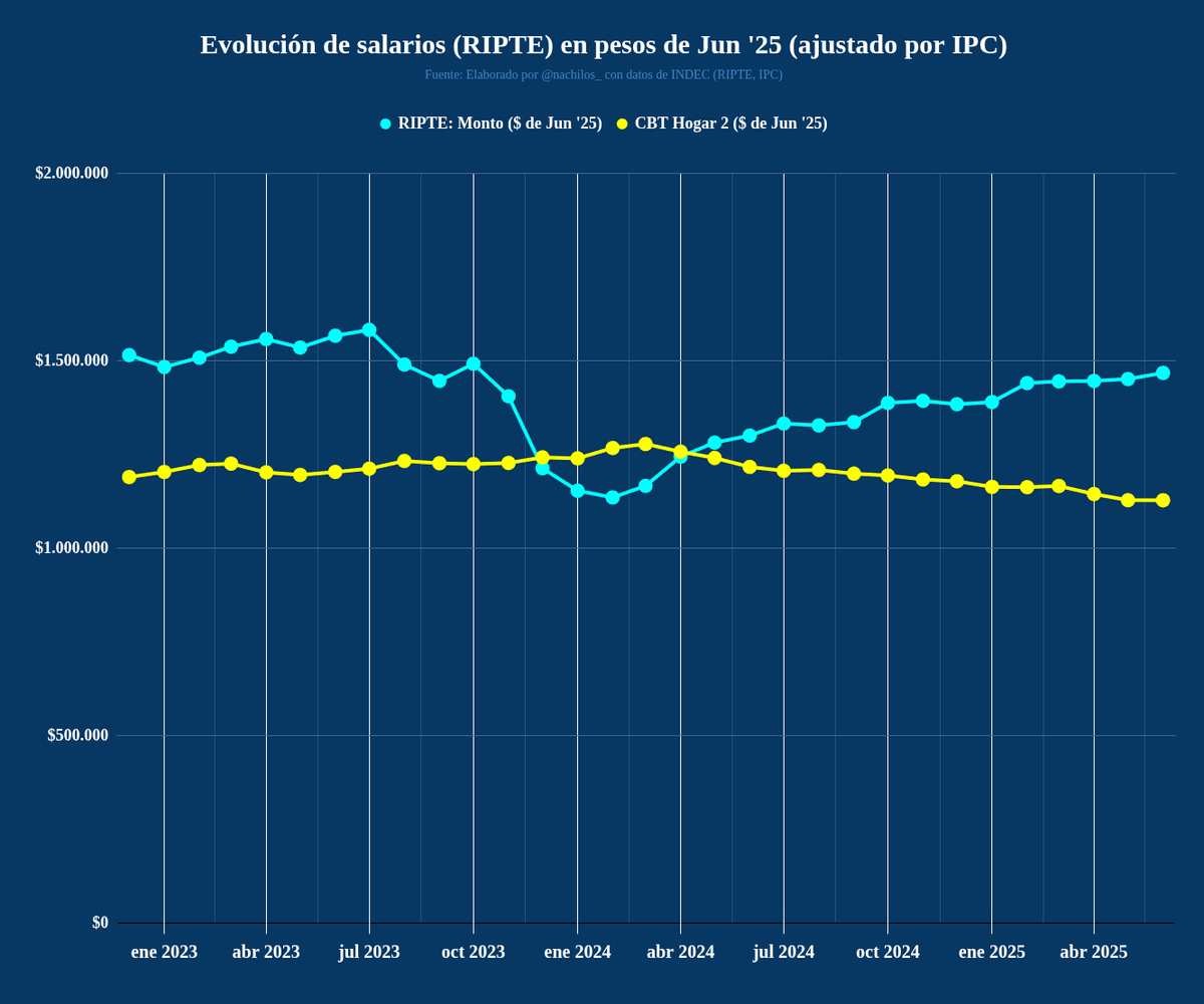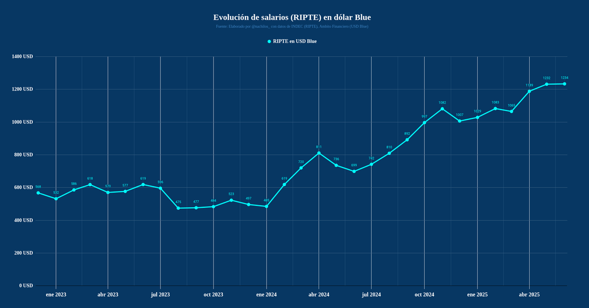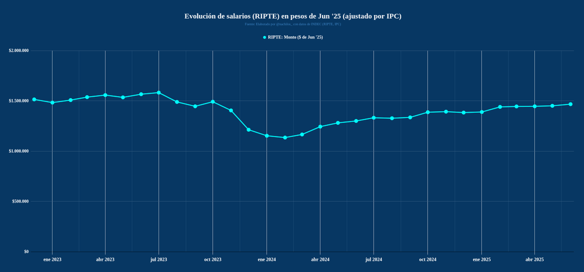 Ejemplo concreto para entender mejor estos de los salarios "ajustados por inflación": El RIPTE (salarios) en Junio 2024 era $933.180. Y en Junio 2025 fue $1.468.136. El problema es que es "injusto" comparar ambos números y decir "Fua, los salarios aumentaron un 57%!". Porque si