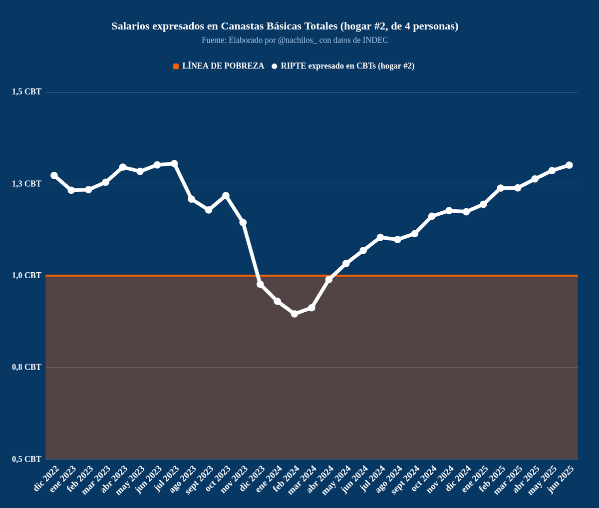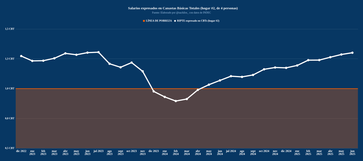 Acá tenemos el análisis de salarios (RIPTE) expresado en Canastas Básicas Totales de un hogar de 4 personas. Comparto un par de conclusiones y matices: 1. Como era de esperarse, pinta similar a la evolución del cálculo en base al precio del pan. Bajonazo a fines del 2023 y