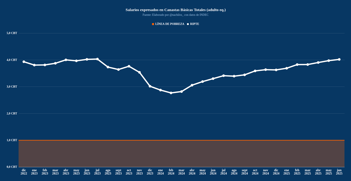 Quizás no sea tan relevante pero ya que lo tengo a mano lo comparto. Este gráfico muestra la evolución del RIPTE expresado en Canastas Básicas Totales de adulto equivalente. O sea: Un adulto viviendo SOLO, sin mantener a nadie, con su salario todo para él. Nótese que la formita