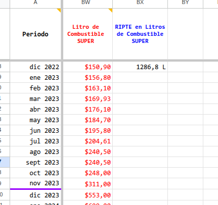 Cargamos los datos en la planilla y ahora solo es cuestión de dividir cada RIPTE por el precio del litro de cada mes. Importante tener claro qué es cada cosa (Litro SUPER, YPF en CABA), y las unidades (al dividir los $ del RIPTE por los $/Litro del precio de combustible te da