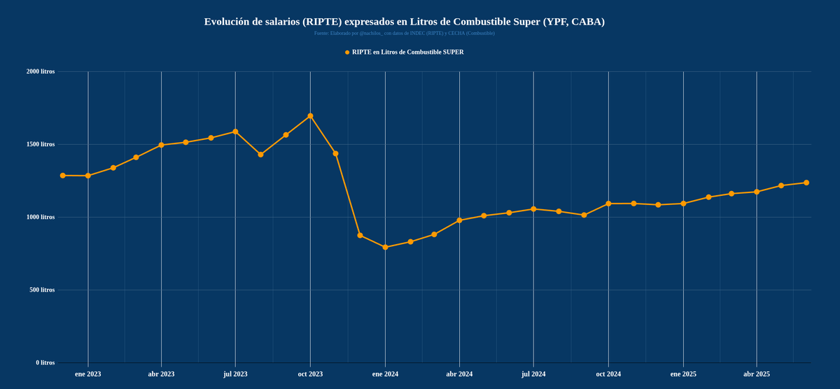 Acá alguien me sugiere que contraste el RIPTE con el precio del litro de nafta. https://x.com/martingegnere/st... La verdad te puedo predecir el resultado antes de hacer el cálculo. A VER, DESAFÍO para todos leyendo esto: ¿Aportaría algo nuevo ese gráfico? ¿Qué pinta esperarían que tenga?