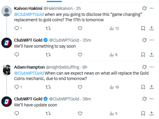 So in summary - honestly, no idea what's coming. ClubWPT Gold without Gold is going to be a thing later today. They say sweeps coins will remain, and there has to be a method of obtaining them free, and through an indirect manner, non-purchased manner, to be sweeps gaming.