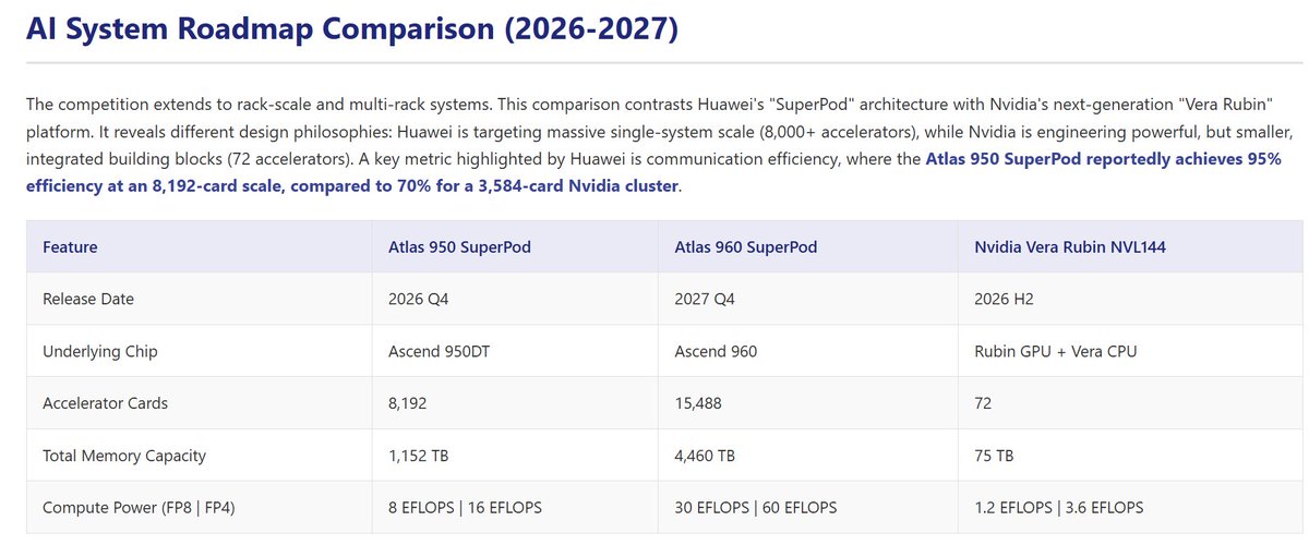 Huawei's latest Ascend AI chip roadmap is breathtaking. TL;DR: further optical+networking optimization to deliver node & cluster level superiority over Nvidia. On single chip basis, the incoming Ascend 950 reaches parity with Hopper. 960 will be on par with Blackwell. 970