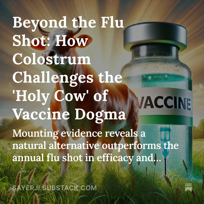5/ 💰 FOLLOW THE MONEY: Flu vaccine market = $8 BILLION (2023) Colostrum = It's a FOOD. Can't be patented Maybe that's why you haven't heard about this natural alternative that outperforms vaccines 3:1? Full article: https://sayerji.substack.com/p... What do you think - time to