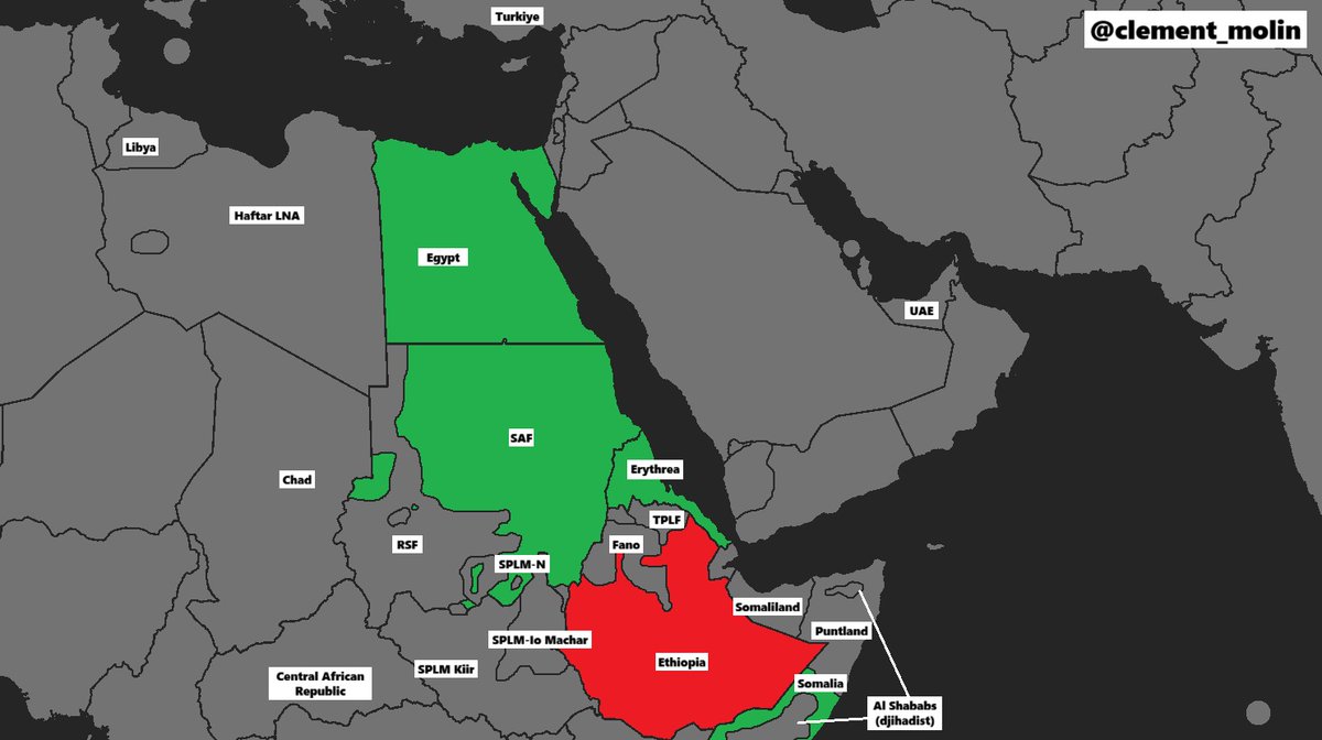 On the other hand, les United Arab Emirates strategy is based around some regional countries and rebellion : -Ethiopia 🇪🇹 -Puntland and Somaliland separatist states of Somalia🇸🇴 -RSF of Sudan 🇸🇩 -Kiir government in South Sudan 🇸🇸 -CAR 🇨🇫 -Chad 🇹🇩 -Libya's Haftar 🇱🇾