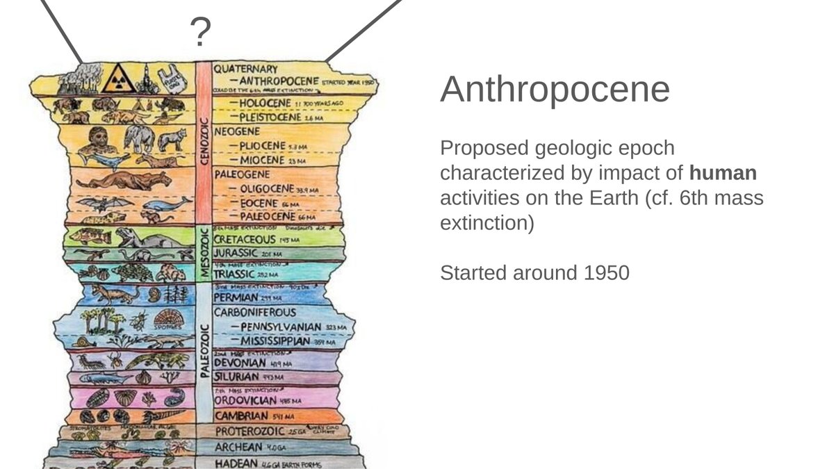 Let's talk about geologic epochs. They are a measure of deep time, divided by distinct changes in life forms, climate, and geological processes, that can be observed in rock strata. Humans are starting to have geologic impact. We are causing the 6th mass extinction in the