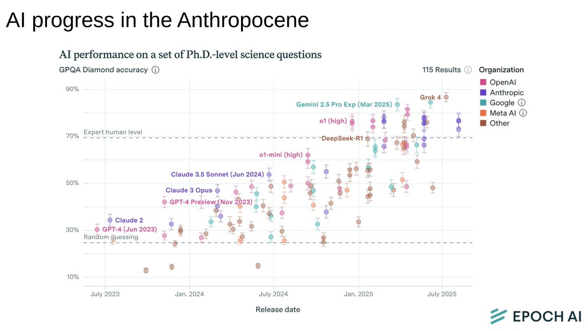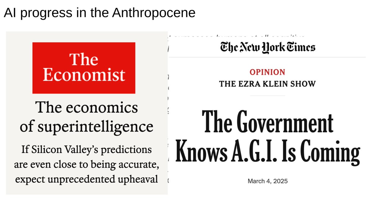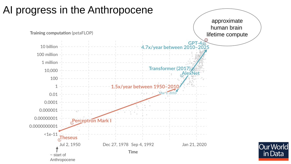 Here is a plot of the amount of compute used to train notable AI models, starting at the beginning of the Anthropocene, through the present. You can see a change in slope around the point where AI models became economically valuable. Each tick on the y axis is two orders of