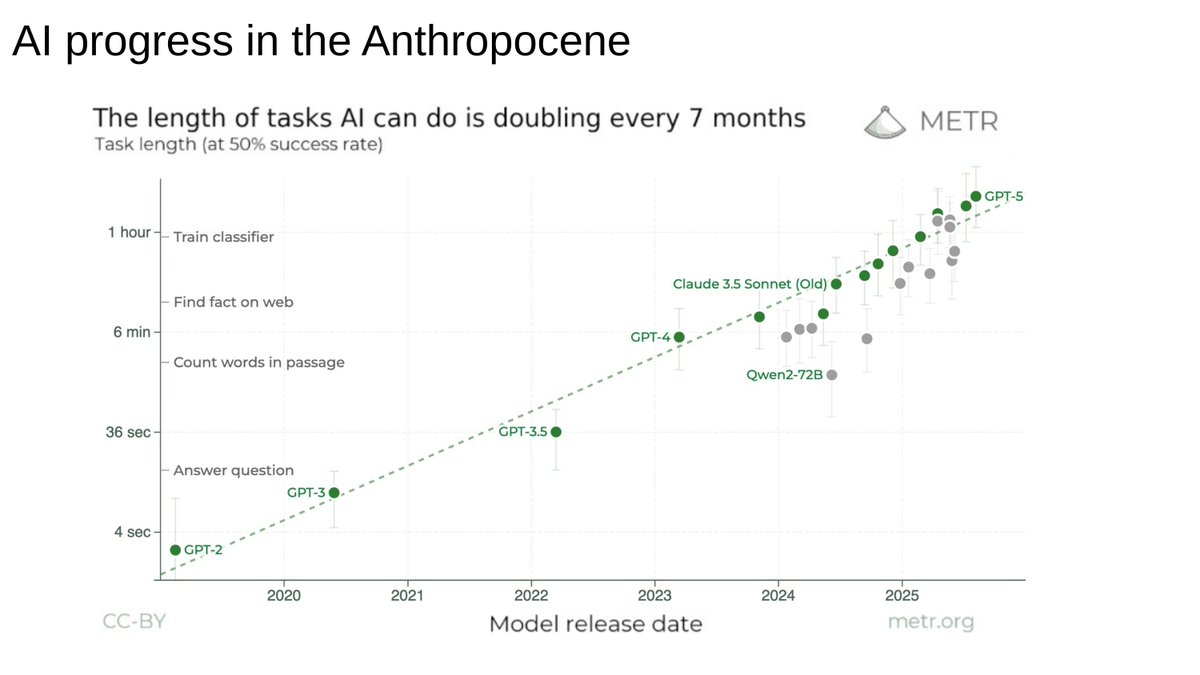It's not just the scale of AI model compute that has been increasing. Here's a recent study from METR looking at the timescale of diverse software tasks which AI models can perform unaided, with 50% success. The timescale is derived by looking at how long it takes humans to