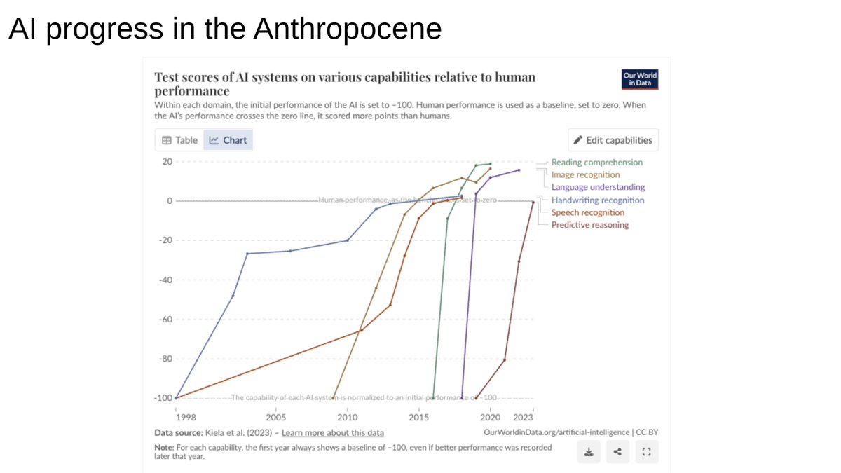 And here's a plot showing the speed at which superhuman performance is achieved on new benchmarks, up through 2023. Up through two years ago. Superhuman performance is reliably achieved, and it is reliably achieved faster and faster. Here the y-axis is performance relative to a