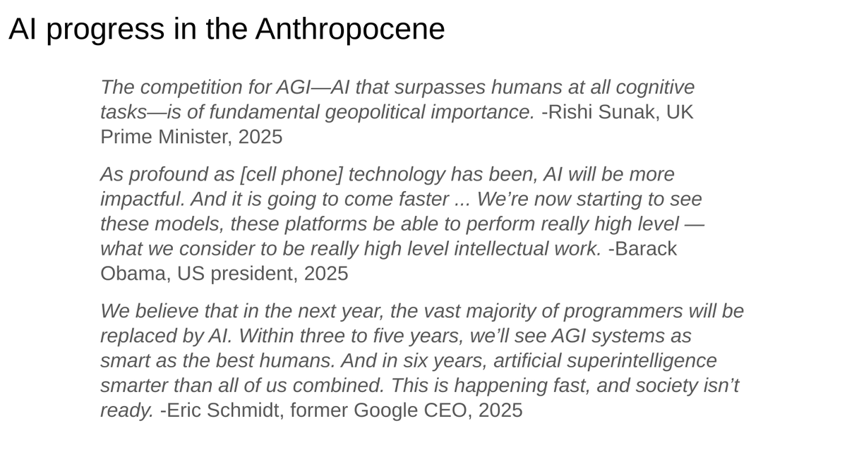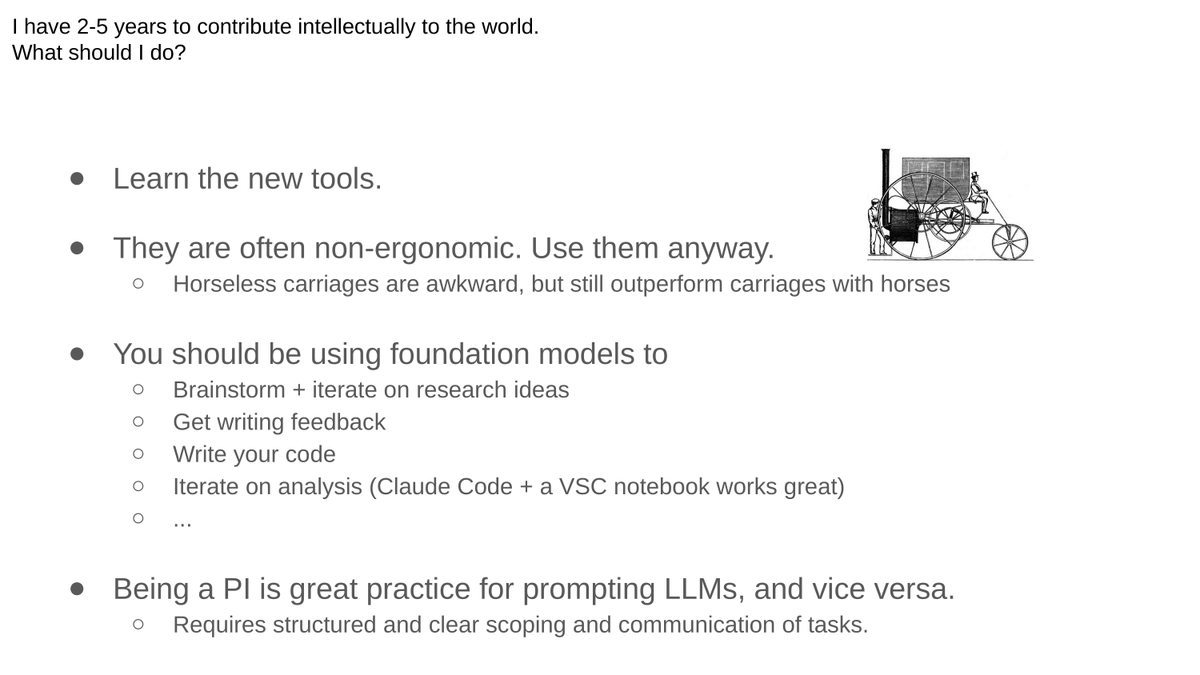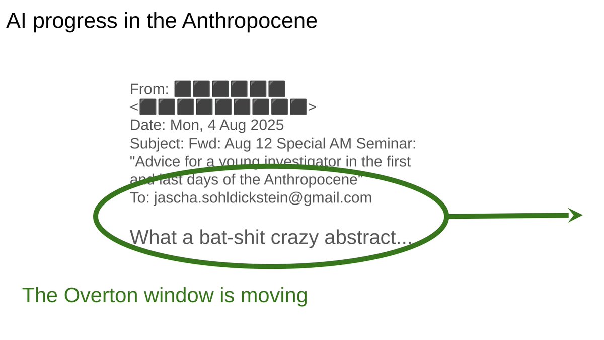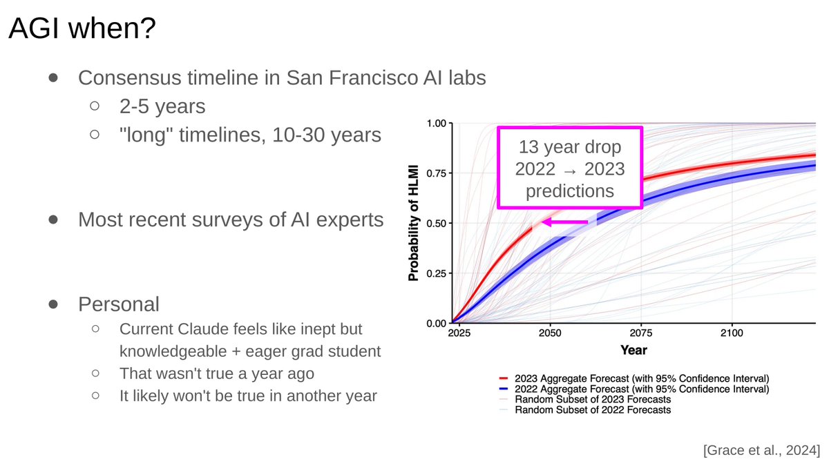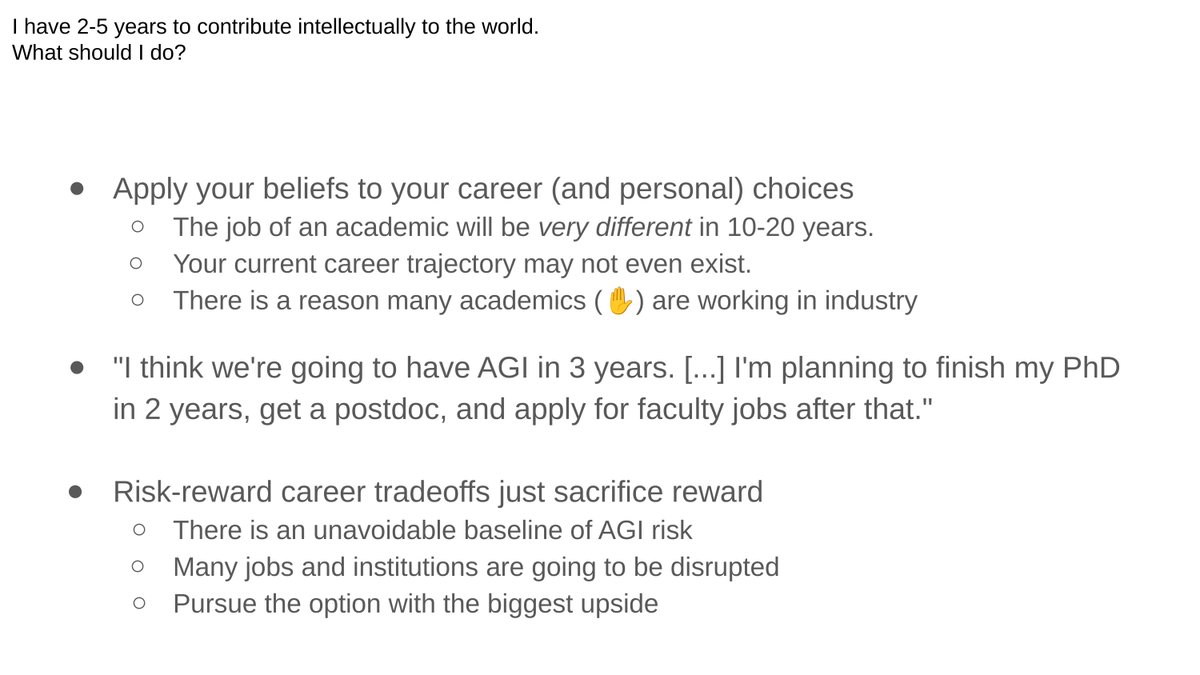This talk was motivated by a recent conversation I had with a very capable grad student, where they were sharing a personal timeline for AGI of 3 years ... and then a few minutes later were talking about their career plans, and ["..."] If you take seriously that AGI is coming in
