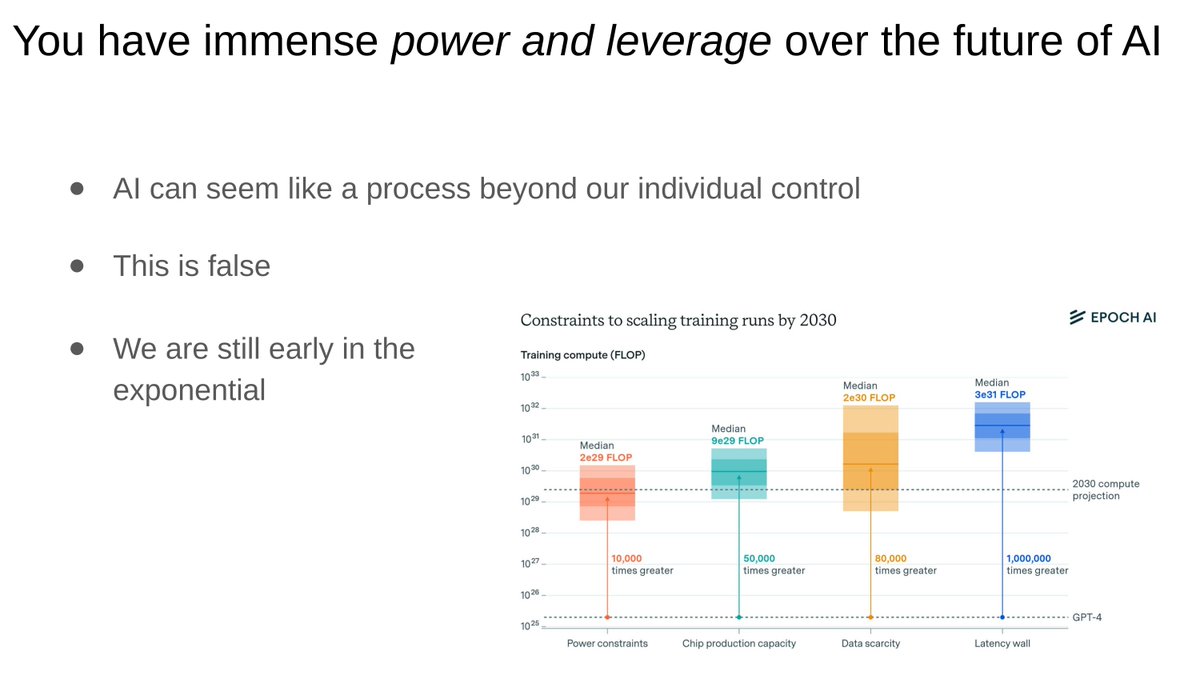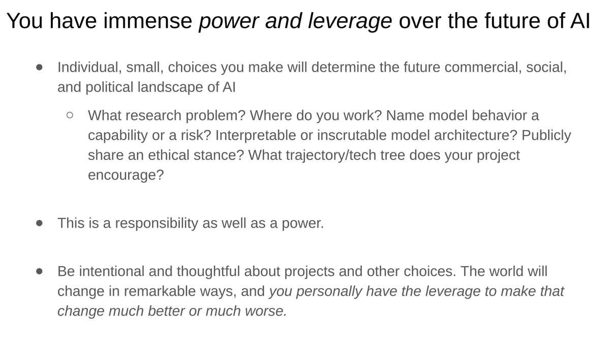 Because we are early in the exponential, and because you are almost certainly capable with highly relevant skills, you have immense power and leverage over the future of AI. This is a responsibility as well as a power. More than at any other point in your life, decisions you