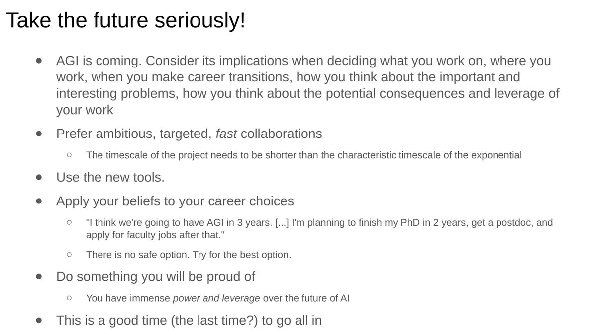 So in summary -- take the future seriously! What you work on, where you work, when you make career transitions, how you think about the important and interesting problems, how you think about the potential consequences and leverage of your work, ... All of these are hugely