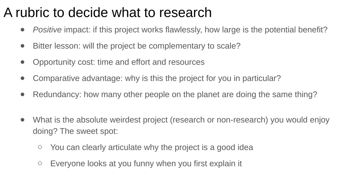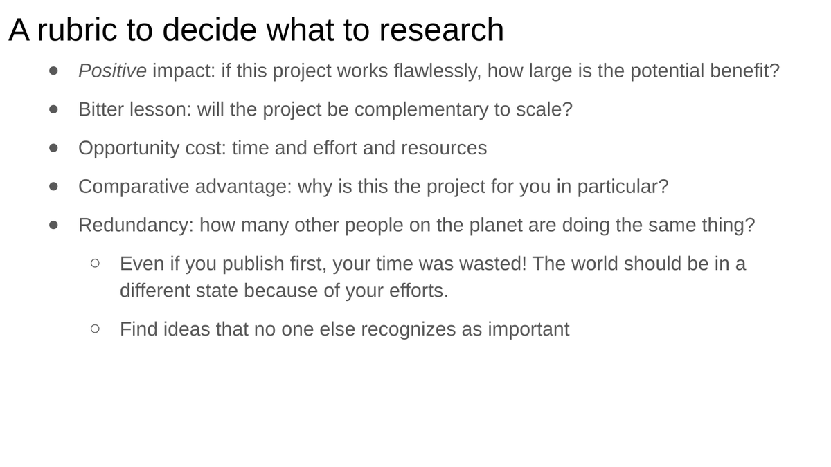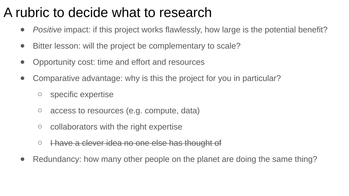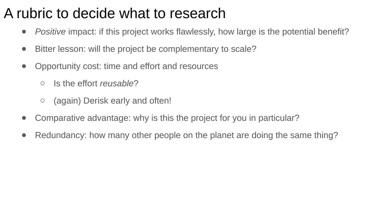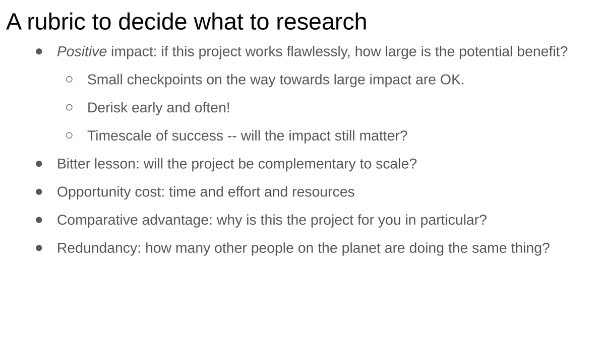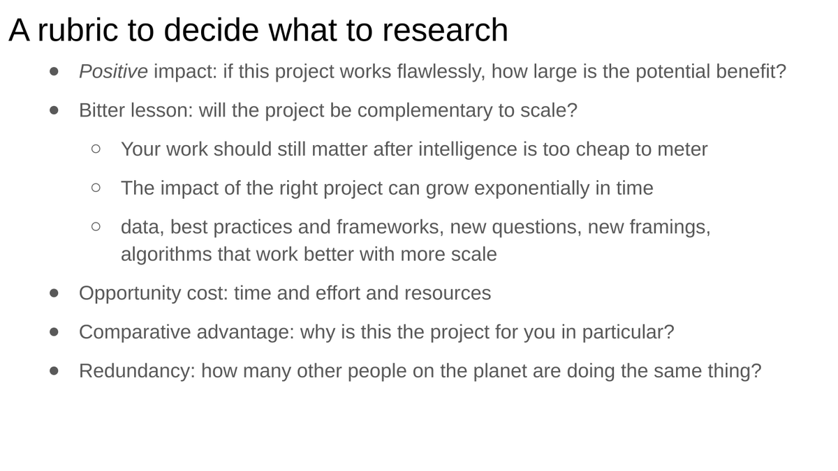 I promised I would give concrete advice -- so let me share with you an actual rubric I use when choosing research projects. This is slightly off-theme for the rest of the talk. It is partially informed by AGI -- but is a good set of questions to ask about a project regardless of