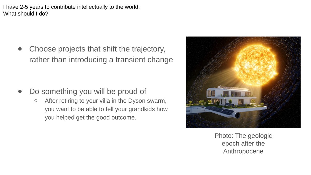 if you have a limited time to contribute, and the stakes are high, you should do something you are proud of!!! When you are retired in your villa in the Dyson swarm, you will want to feel that you helped get to a positive outcome. You should also choose projects that will have