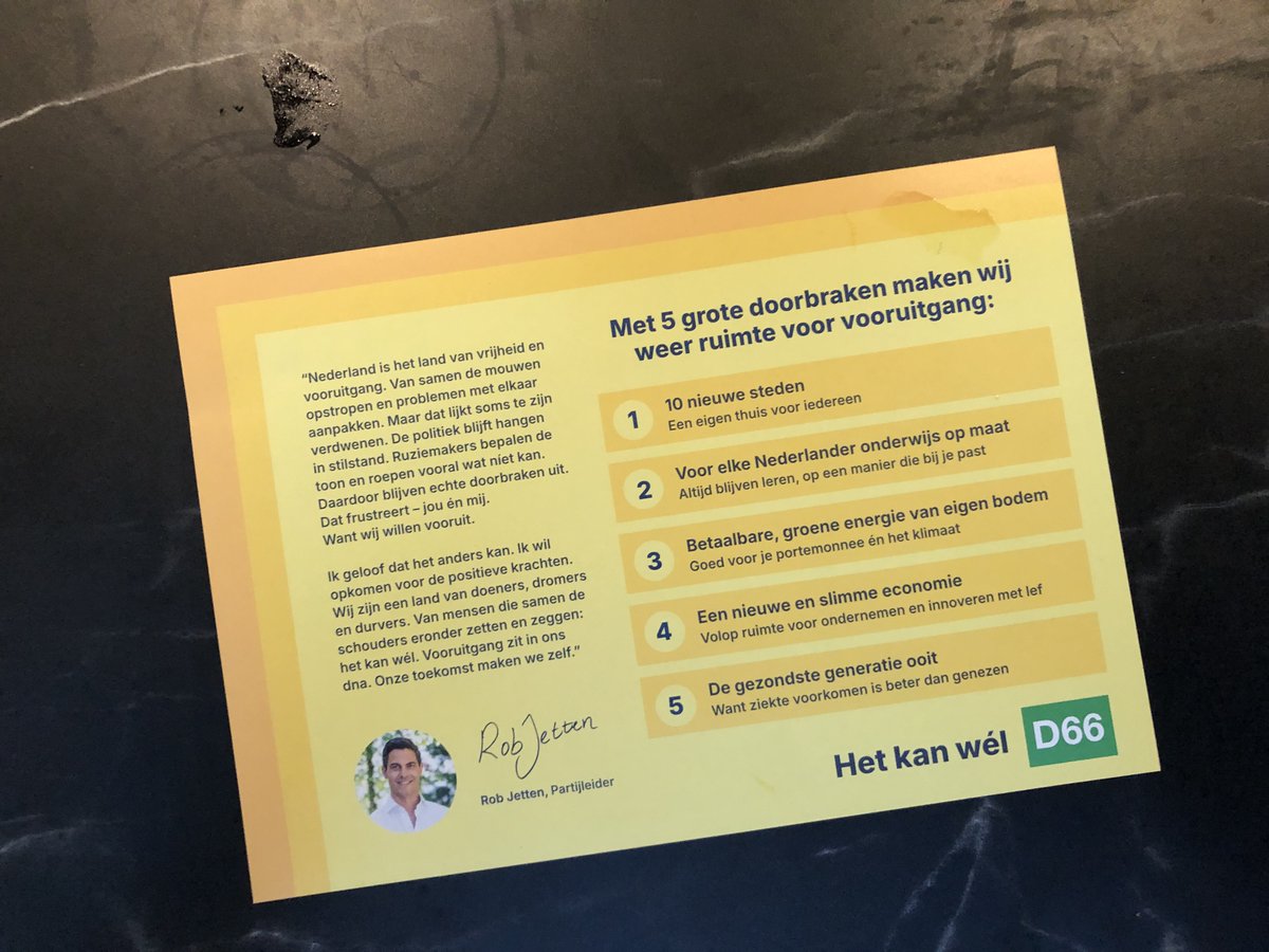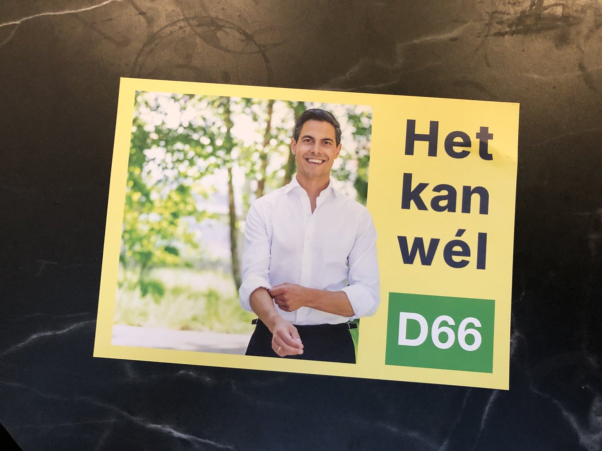 Overal liggen deze flyers. Opvallend: D66 zocht de publiciteit met een andere - hardere - koers op migratie maar op de flyers is daar niks over de vinden.