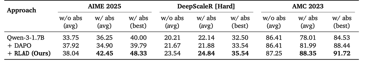 Benchmarks: On AIME 2025, DeepScaleR Hard, and AMC 2023, RLAD beats prior RL fine-tuning (DAPO) by up to 48%. And even when not given abstractions at test time, RLAD-trained models still outperform baselines meaning they internalized that structured thinking. That’s the big