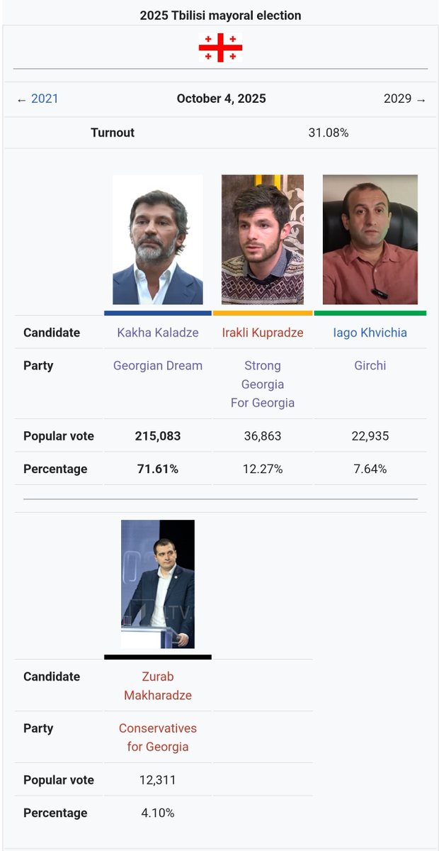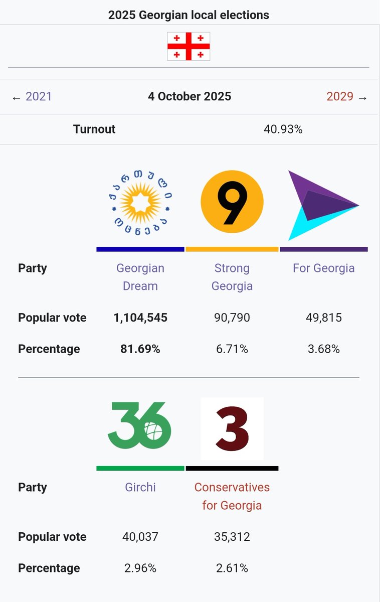 🇬🇪 Wszyscy wczoraj skupieni byliśmy na Czechach i wygranej Babiša, tymczasem również wczoraj w Gruzji odbyły się wybory samorządowe. Rządząca pro-rosyjska partia Gruzińskie Marzenie po tym jak zamknęła w więzieniach większość posłów opozycji teraz wpisała sobie do Excela wynik