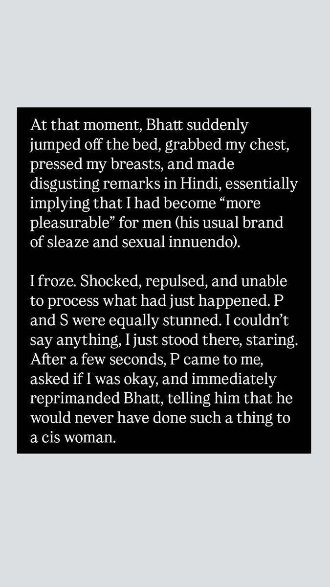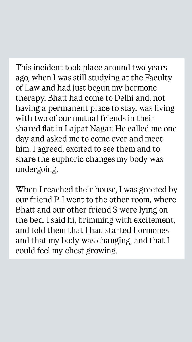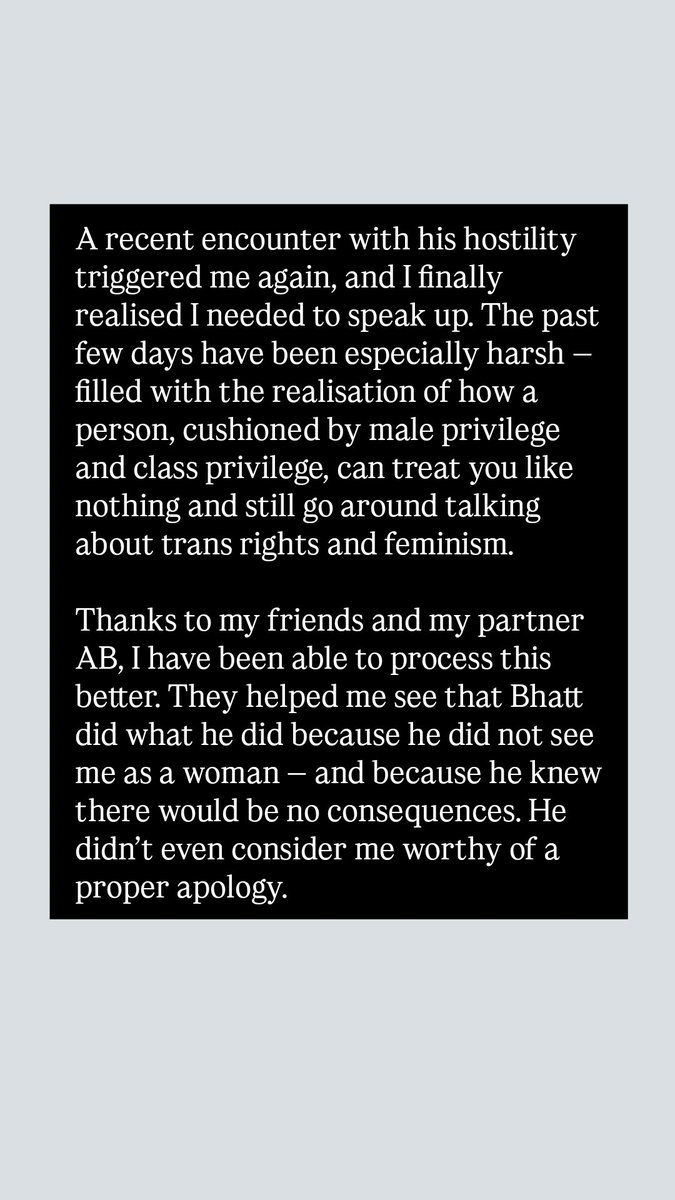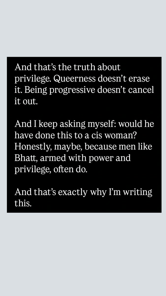 @Lawyer_Saheba So brave of @Lawyer_Saheba to speak up against the predator that Bhatt is. Apparently, studying law & exhorting sermons on feminism/queer culture doesn’t prevent a privileged leech from leeching onto innocent people. More power to you girl 👏