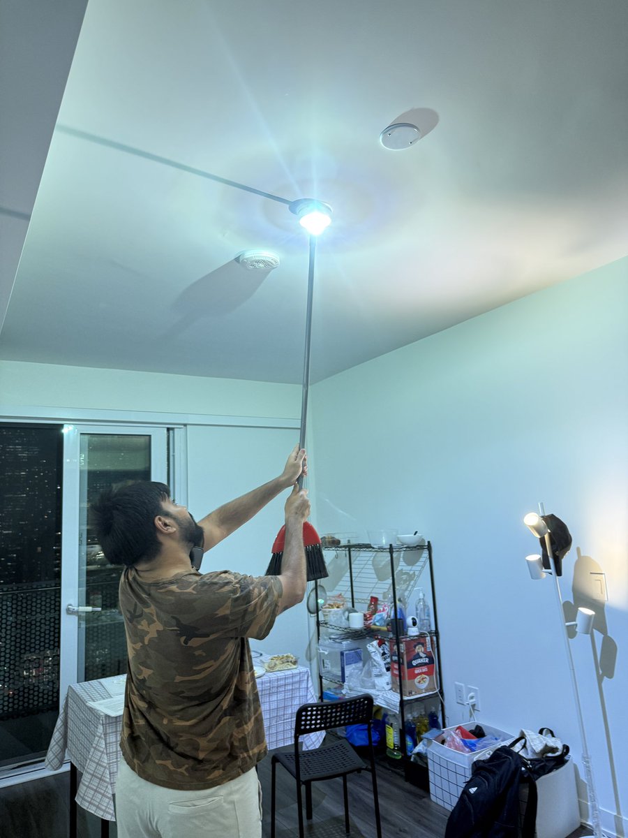 В итоге парень вытолкнул ее из квартиры и отправил вниз к консьержу, пока мы думали че делать с не выключающейся пожаркой. Мы решили ее просто механически выкрутить. Тк я был единственным высоким челом, поручили это делать мне