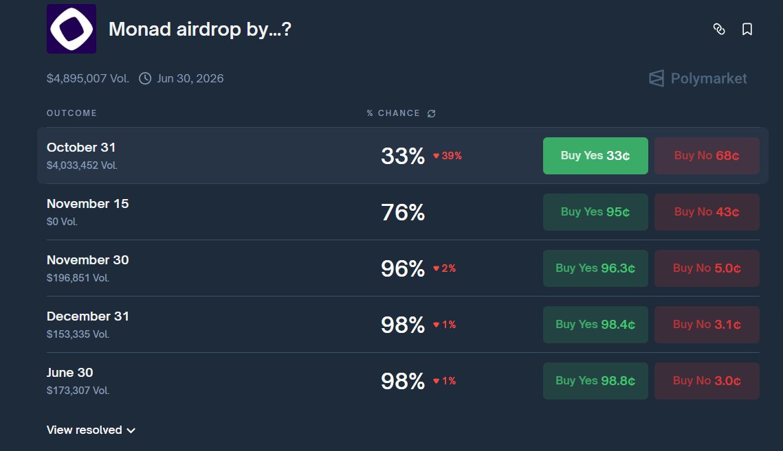 @KyleDeWriter @polyfactual By the way, everyone there is betting that Monad will make a listing by the end of this month, but if you look, most are betting hundreds of dollars that it won't happen this month. I think someone knows more than we do. Maybe there will be a drop for NFT, but not for TGE.