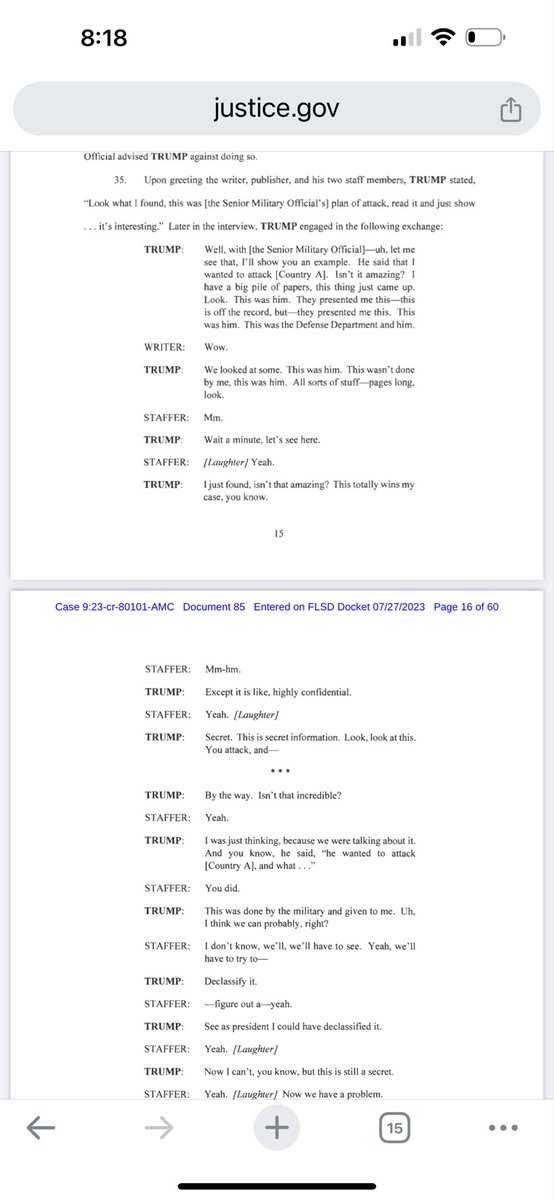 @TedCornwell Cite your credible source and link. I guarantee you can’t. Primarily because they were never declassified by Trump. He even admits it in the indictment, Mo. Receipt ⬇️