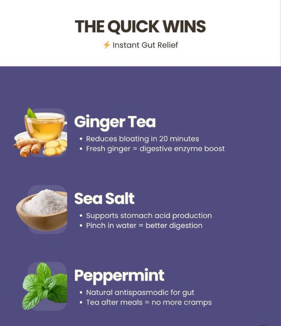 1. THE QUICK WINS Need instant gut relief? → Ginger Tea: reduces bloating in 20 mins → Sea Salt: boosts stomach acid → Peppermint Tea: calms cramps fast Start with these before you reach for pills.