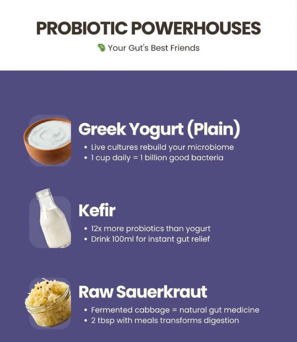 2. PROBIOTIC POWERHOUSES Your microbiome LOVES these: → Plain Greek Yogurt: 1 cup = 1 billion good bacteria → Kefir: 12x more probiotics than yogurt → Raw Sauerkraut: 2 tbsp = gut transformation Ferment your way to better digestion.