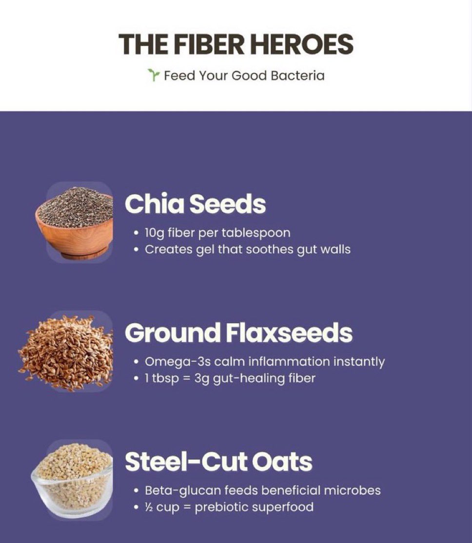 4. THE FIBER HEROES Fiber feeds your good gut bugs. → Chia Seeds: 10g fiber per tbsp → Flaxseeds: omega-3s + gut-soothing gel → Steel-Cut Oats: beta-glucan = prebiotic gold Don’t starve your microbiome.