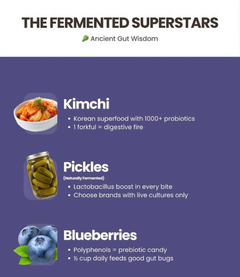 5. THE FERMENTED SUPERSTARS Ancient wisdom meets modern science: → Kimchi: probiotic firepower → Naturally Fermented Pickles: lactobacillus in every bite → Blueberries: polyphenols = gut candy Feed the bugs that love you back.