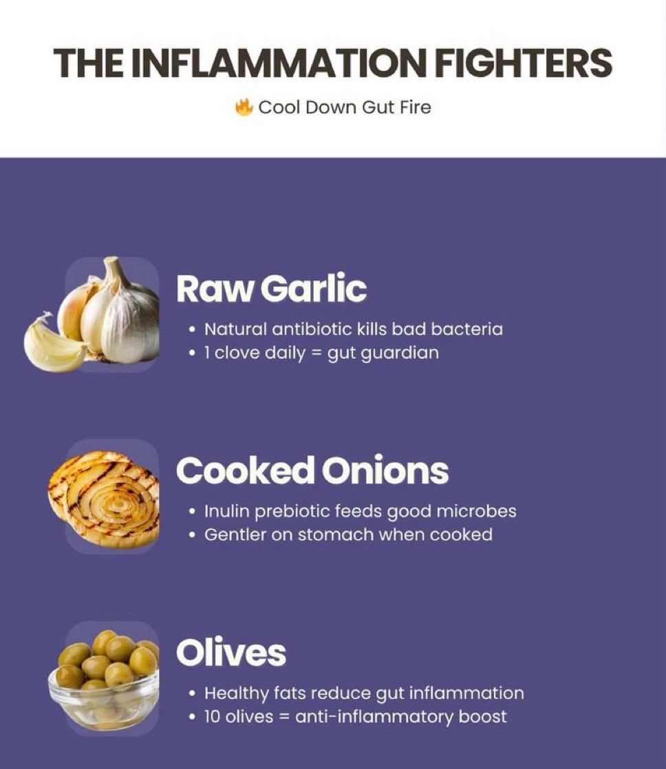 7. THE INFLAMMATION FIGHTERS Calm the gut fire before it spreads. → Raw Garlic: nature’s antibiotic → Cooked Onions: gentler, prebiotic-rich → Olives: 10 a day = inflammation shield Eat to soothe, not to spark.