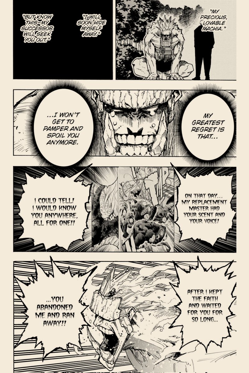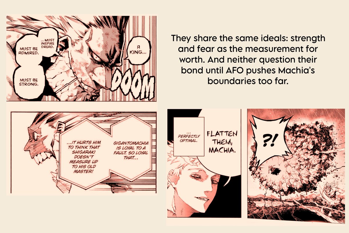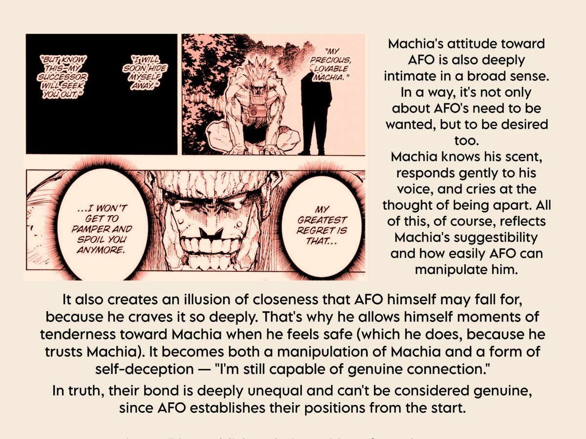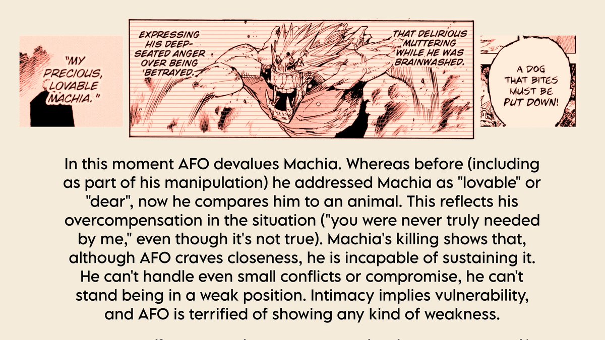 AFO's need to be wanted and exclusive is fulfilled by Machia and his absolute loyalty. Machia obeys him, waits for him. AFO is his only meaningful bond, not rooted in blood. Machia chose him, and that feeds his ego. it's his way of proving to himself that the problem isn't him.