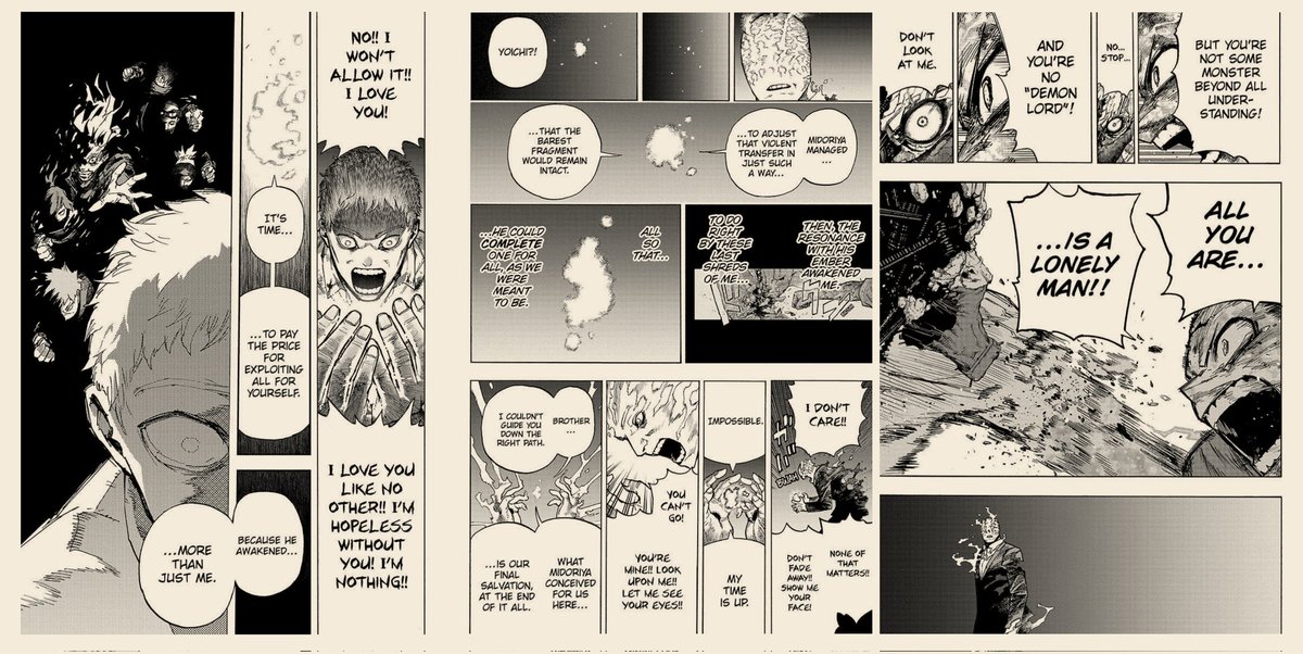 Midoriya points out that AFO is, in fact, deeply lonely. this underscores the importance of compassion, the ability to give without expecting anything in return, and the courage to show vulnerability and open up to others. everything AFO lacked becomes the cause of his downfall.