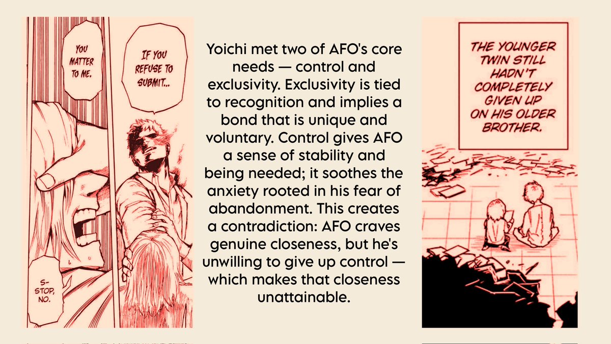 to make Yoichi believe that without him, he is worthless. to feel safe, AFO needs to control Yoichi — a role not of a brother, but of a parent. he also demands exclusivity in their bond: since he has no one else, Yoichi shouldn't either. which is more like a partner's role.