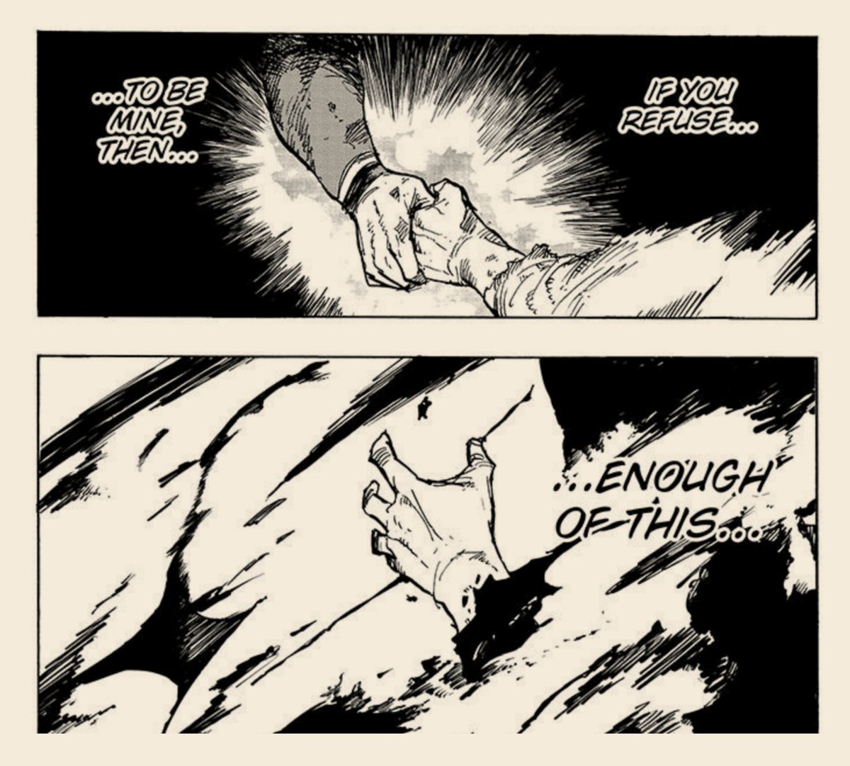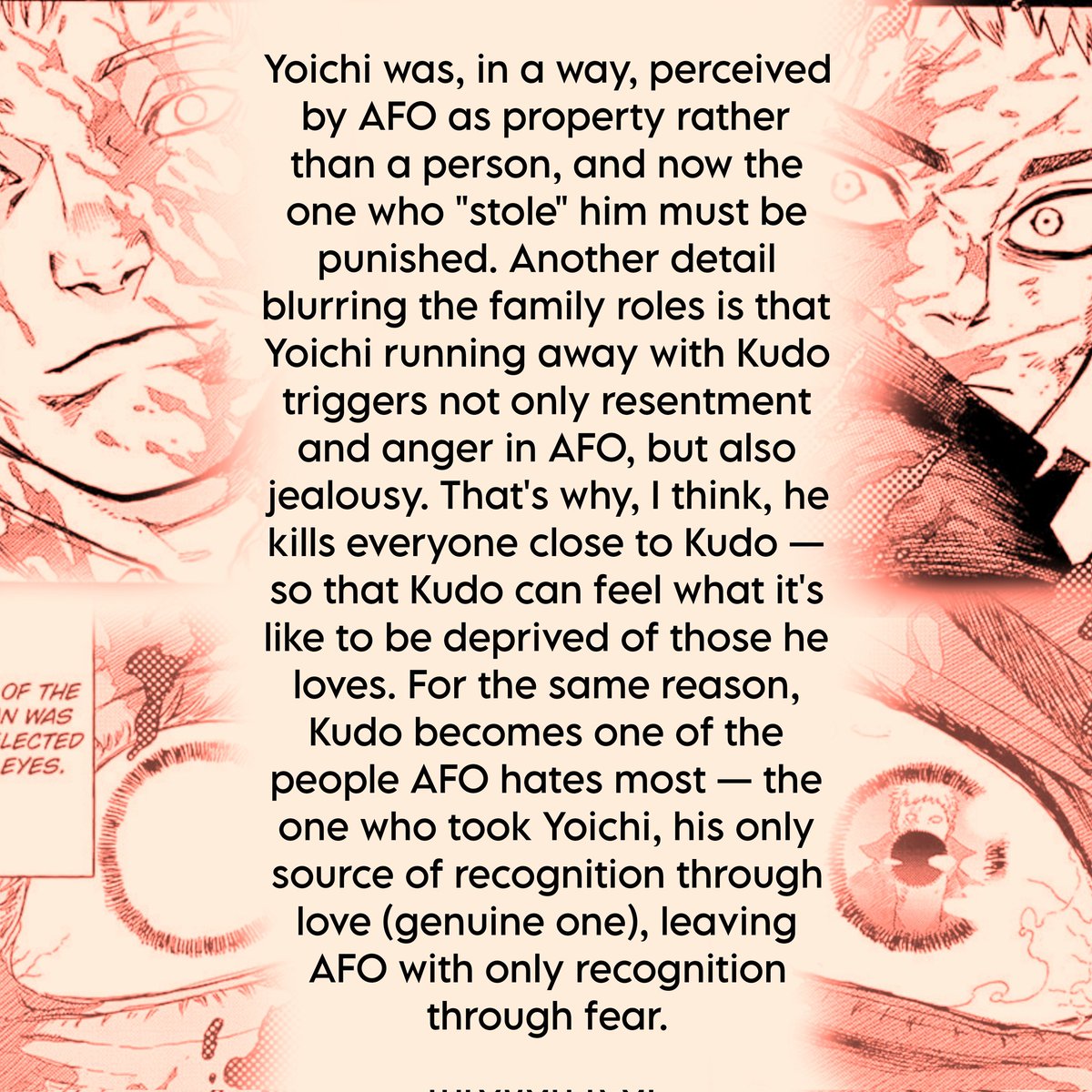 killing Shigaraki is AFO's fear of separation made manifest. Shigaraki begins to become something separate from him, just like Yoichi once did. AFO consumes him to claim him completely and eliminate any chance of rejection. this reveals AFO's inability to let go or forgive.