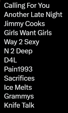@sachi_santana @Mpho1458609 first, (refer to 1st image) second, wtf do you mean an entire black panther album with atl artists?? the only two atlanta artists on that album are future and 2 chainz, two out of 21 artists. should i compare that to these lists of drake collabs? (as well as all of her loss)