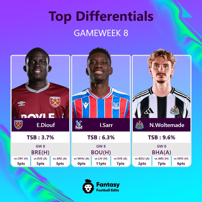 π Differentials My favourite differentials for GW8 π π² Diouf - Assist threat, on some set pieces, and an easier fixture π² Sarr - On fire since returning from injury, converting his chances well π² Woltemade - 3 goals in 4 games, and the focal point of the Newcastle attack