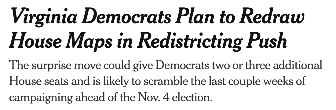 The plan here is simple: >Pass a repeal of the constitutional amendment setting up a bipartisan redistricting commission literally days before the November election. >Pray this does not result in any sort of backlash in races for the House of Delegates. >If Democrats win in two