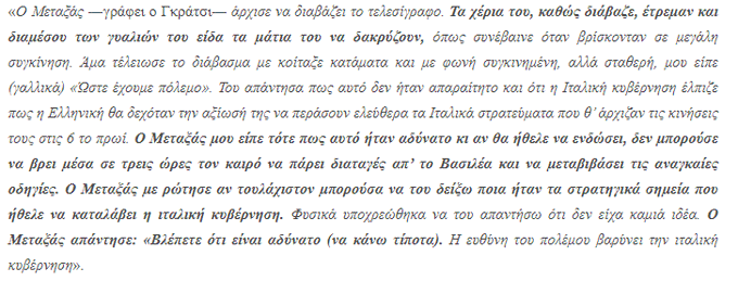 τέλους," γράφει ότι ο Μεταξάς έτρεμε και και αφου απλά είχε αναγνωρίσει την κήρυξη πολέμου("Alors, c’est la guerre"-ώστε έχουμε πόλεμο),έλεγε ότι "και αν θα ήθελε να ενδώσει, δεν μπορούσε να βρει μέσα σε τρεις ώρες τον καιρό.." και "αν τουλάχιστον μπορούσα να του δείξω ποια ήταν