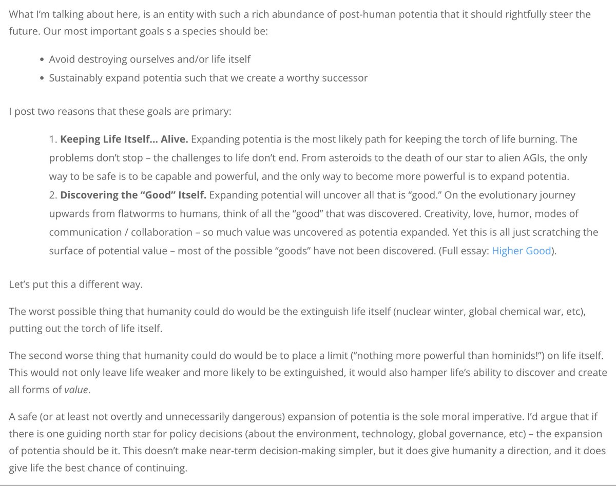 @danfaggella @xriskology My primary concern with your work is that it does not actually help make a worthy successor. It seems to operate in a universe in which this just happens a priori, but we do not live in that universe. As a matter of practicality it accelerates towards human extinction.
