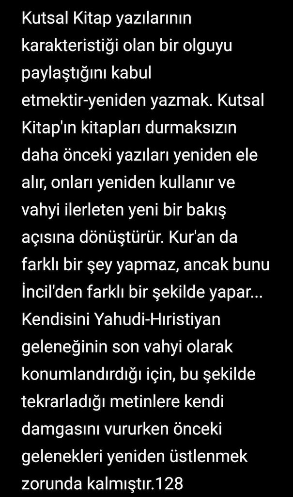 Hiçbir aklı başında oryantalist Kuran-ı Kerim önceki kitaplardan alıntı yaptı demez. Kendi kariyerine bu kötülüğü yapmaz. Onlar vahye inanmadığı için eski kitapların içeriğinin önceki metinlerden bağımsız olarak yeniden kurgulandığını söyler. Zira Kur'an-ı Kerîm'de önceki