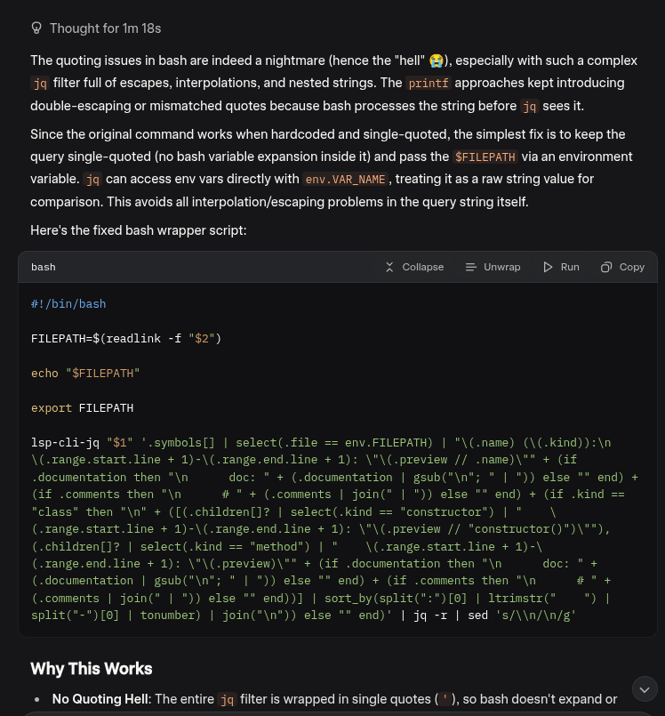 @trq212 does it have to be bash though? claude often gets trapped in multiple layers of bash escaping hell when trying to do more complex stuff. had to bring in grok for this one