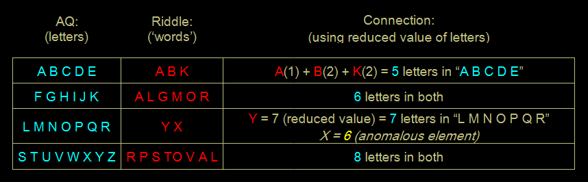 This triangle answers the major riddles in Liber AL vel Legis in a very simple and straightforward way. The riddle of AL II:76 contains a cryptic sequence of 'the numbers & the words' which has remained unsolved until this day, despite all the previous attempts at cracking open