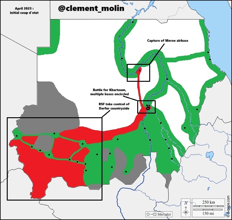 The main fightings in 2023 erupted in all the main cities, with the RSF controling the Darfur region and part of Khartoum after April 15th coup attempt. They also took the Meroe airbase and captured egyptian and sudanese pilots.