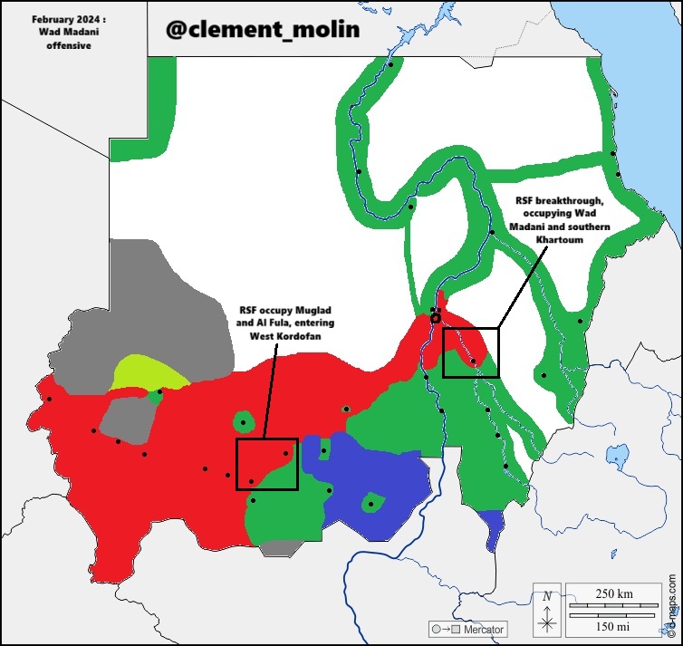In december 2023, the RSF, unable to capture the main bases of the armed forces in central Khartoum pushed instead to Wad Madani, in the fertile Gezira state. At the same time, it continued its offensive in West Kordofan until february.