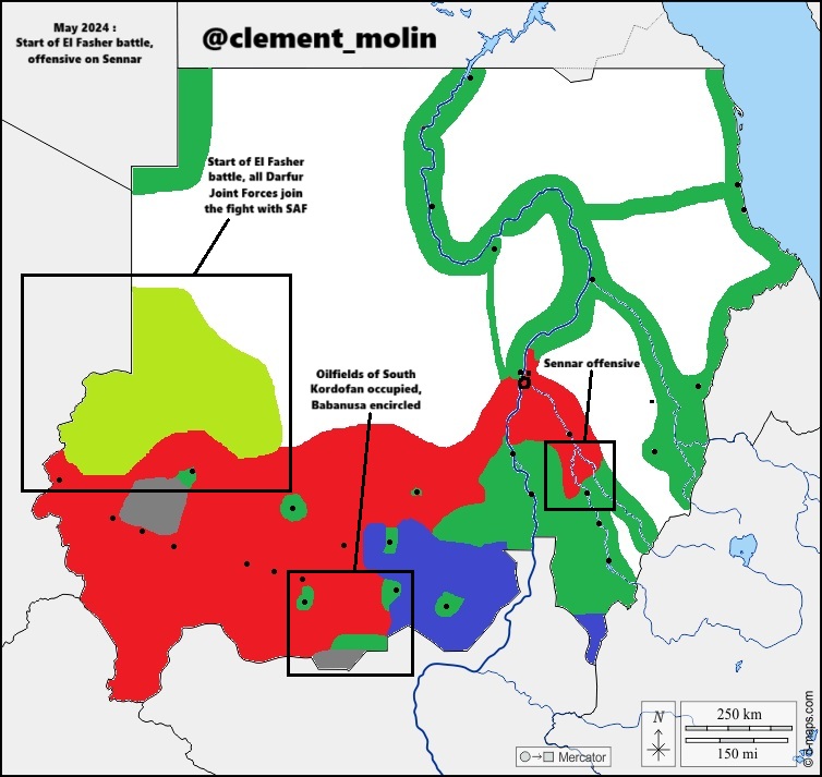 In May 2024 most of Joint Forces of Darfur joined the army alignated troops. The RSF pushed to Sennar and in the oilfields of Kordofan.