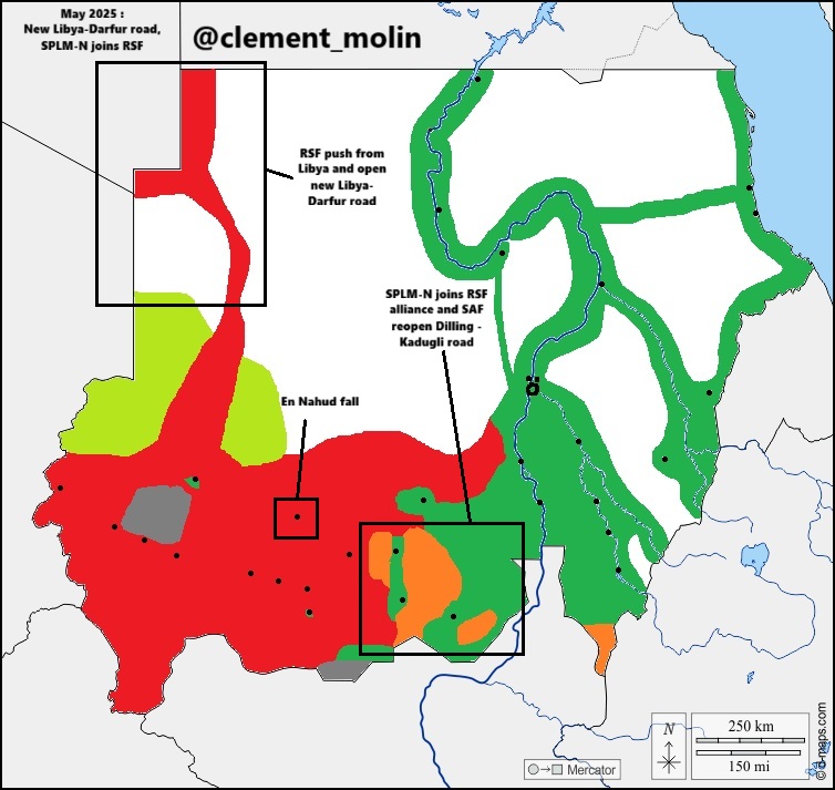 In may, En Nahud fell and the SPLM-N joined the Tassis alliance of the RSF. The SAF took the opportunity to reopen the Dilling-Kadugli road. The RSF managed to open a road to Libya, pushing from southern Libya.