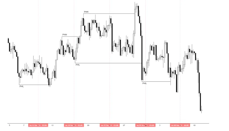 2.1 Types of Liquidity The Highs and Lows of the previous month/week/day are strong liquidity accumulation zones. PWH/PWL: Previous Week High (PWH) / Previous Week Low (PWL)