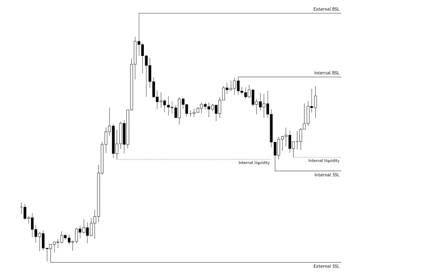 2. Types of Liquidity Internal liquidity refers to price levels and imbalances within a defined range, often appearing as FVG External liquidity refers to price levels outside that range, such as old highs or lows (swing highs and lows)