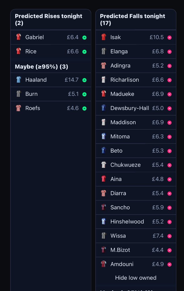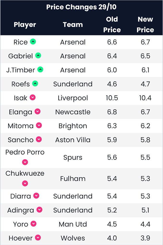 Price Changes ⬆️ Gabriel + Rice ✅ + Roefs (was maybe) + Timer (not predicted ❌) ⬇️ Isak + Elanga + Mitoma + Sancho + Chukwueze + Adingra + Diarra (predicted ✅) + Pedro Porro + Yoro + Hoever (all three were a maybe ❌)
